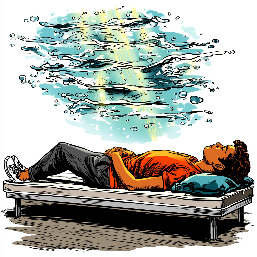 Lehni si na záda, dej ruce na břicho a zavři oči. Začni sledovat, jak se břicho s nádechem zvedá a s výdechem klesá – jako bys ležel na vodě a vlny tě houpaly. Dýchej nosem, výdech pusou. Pomalu, rytmicky, klidně. Když přijde myšlenka, nech ji uplavat. Houpání tě zklidní a přenese do módu „je mi všechno jedno a to je dobře“.